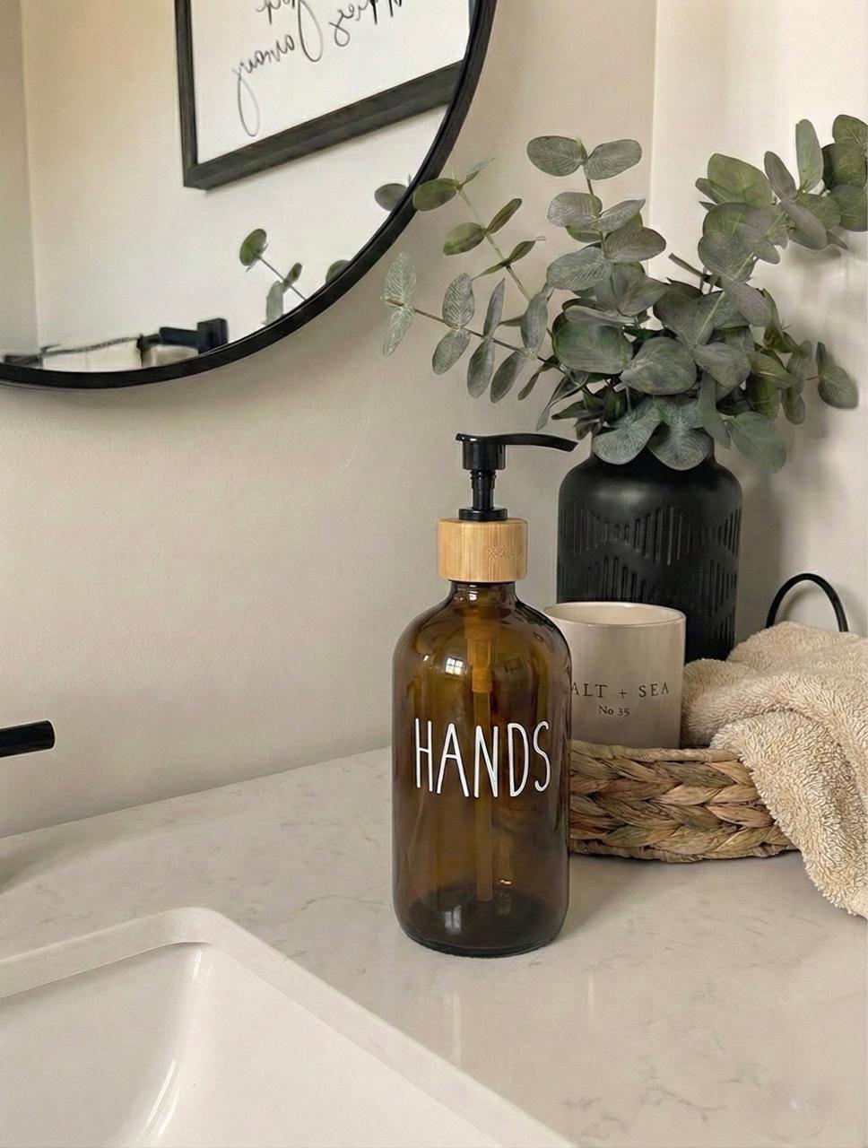 Dispenser color ambar con impresión “HANDS” tiene bomba dispensadora . Es ideal para organizar tus productos de la higiene personal. Medidas aproximadas: 20×10 cm. Capacidad: 500 ml. Las imágenes es a modo ilustrativo.